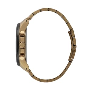O mostrador preto texturizado agrega profundidade ao visual, enquanto os subdials do cronógrafo reforçam o caráter funcional do relógio. Os marcadores e ponteiros dourados garantem excelente leitura das horas, além de trazer um toque premium ao conjunto. O calendário posicionado entre as 4 e 5 horas adiciona praticidade no uso diário.