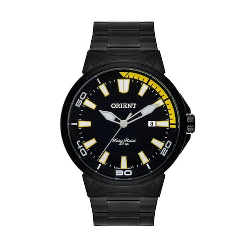 Características Quartz / Bateria Coroa: Simples Tampa posterior : Rosqueado Resistência à água : 50m Vidro : Cristal Mineral Mostrador : Preto com detalhes amarelo Material da caixa : Aço Inox Preto Material da pulseira : Aço Inox Preto