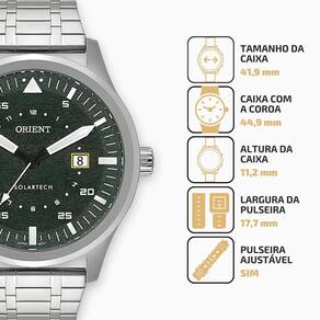 Marca: orient Referência: MBSS1487E1SX Modelo: solartech Ficha Técnica: Formato da caixa: Redondo Gênero: Masculino Cor: Prata Cor do mostrador: Verde Material da Pulseira: aço inoxídavel Material da Caixa: Aço inoxidável Mostrador: Analógico Mecanismo: Solartech Nivel de Resistência à Agua: 5 ATM 50 metros Material do Vidro: Cristal Mineral Tipo de Fecho: Dobrável com botao Tipo de Coroa: Botão padrão Fundo: Rosqueado Medidas: Pulseira Ajustável: Sim Tamanho da Caixa: 41,9 mm Altura da Caixa: 11,2 mm Dimensões da Caixa com a Coroa: 44,9 mm Largura da Pulseira: 17,7 mm Itens Inclusos: Funções: - Solartech com autonomia de 4 meses - Calendário com dia do mês - Mostrador texturizado - Precisão: 15 segundos por mês - Index e ponteiros de hora e minutos com luminosidade de 12 meses para todo o Brasil. Marca: Não Informado Ean: 7891529260326