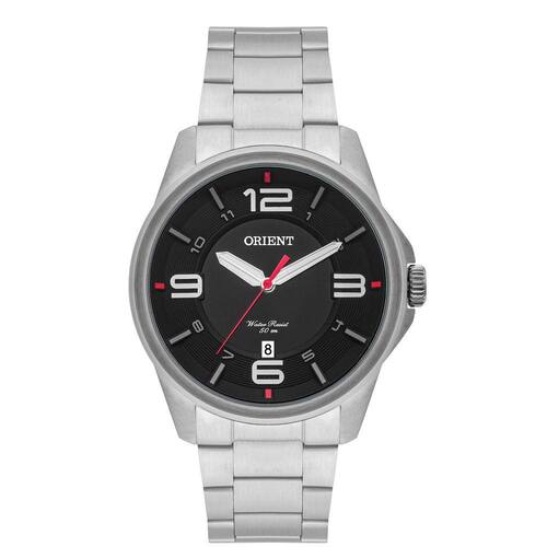 Máquina movida a bateria / quartz Mecanismo Analógico com 3 ponteiros Caixa do relógio em aço inoxidável prateado Pulseira de aço inoxidável prateado Fecho com botões laterais de pressão para abertura Mostrador preto Vidro de Cristal Mineral Relógio com calendário dia do mês Coroa simples de pressão padrão sem rosca Tampa posterior rosqueada Resistência à água 5ATM (50M)