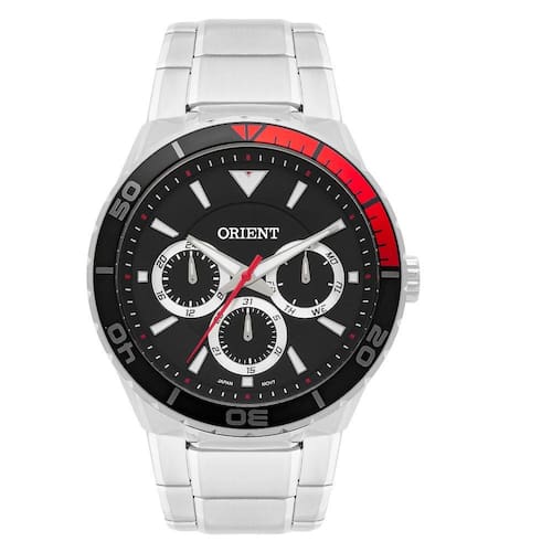 Possui mecanismo analógico, sua pulseira na cor prata é fabricada em aço, vidro fabricado em cristal mineral e mostrador cor preto com detalhes vermelho. A caixa na cor prata é também fabricada em aço, medindo 4,6 cm de diâmetro, no formato redondo. O relógio tem nível de resistência à água especificado 50M / 5ATM.