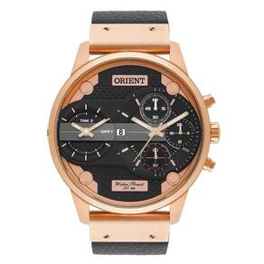 Marca: Orient Modelo: Mrsct001 P1px Categoria: Masculino Coleção / Linha: Sport Cronógrafo Tamanho: Grande Funções : - Analógico - Cronômetro progressivo - Calendário dia do Mês - Horário 12/24 horas - Timer T2 Características - Sistema de energia : Bateria / Quartz - Coroa: Simples - Botões: Simples - Tampa posterior : Rosqueado - Resistência à água : 50M - Vidro : Cristal mineral - Mostrador: Preto com detalhes Rose - Material da caixa : Aço Inox Rose - Material da pulseira : Couro Preto Reforçado Medidas - Diâmetro da caixa : 4,7cm - Espessura da caixa : 1,1cm