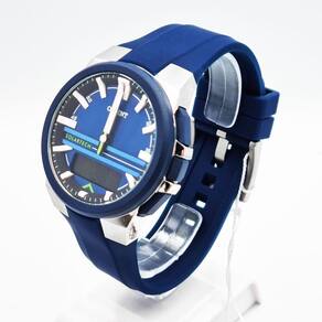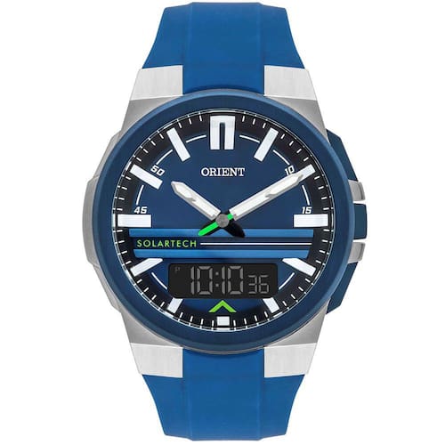 Características Formato do Relógio: Redondo Composição do Vidro: Cristal mineral Material da Caixa: Aço Inox Cor da Caixa: Azul, Prata Cor do mostrador: Azul Material da Pulseira: Borracha Cor da Pulseira: Azul Mecanismo: Analógico-Digital, Solar