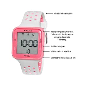 Estamos há mais de 50 anos no mercado oferecendo uma ampla variedade de acessórios, incluindo relógios e óculos de sol, com as melhores marcas e estilos. Além disso, a nossa equipe é treinada para oferecer um atendimento excepcional, garantindo que cada cliente seja tratado com o respeito e a atenção que merece.Realizando a compra, não deixe de nos avaliar Sua opinião é muito importante para aperfeiçoar cada vez mais o nosso trabalho.ESPECIFICAÇÕES TÉCNICAS- Marca: X-Watch- Referência:XGPPD197- Gênero: Feminino- Tipo de mostrador: Digital- Tipo de movimento: Quartz- Tipo de fecho: Fivela- Cor da caixa: Rosa- Cor do mostrador: LCD Positivo- Cor da pulseira: Branca por fora e Rosa por dentro- Material da caixa: Policarbonato- Material da pulseira:Silicone- Largura da caixa:3,6 cm - Espessura da caixa:1,5 cm - Largura da pulseira:2,2 cm - Resistência à água:10 ATM 10M - : 1 ano Marca: Não Informado Ean: 7891529244555