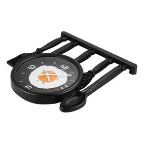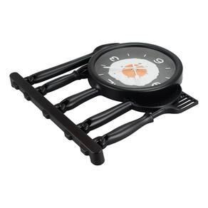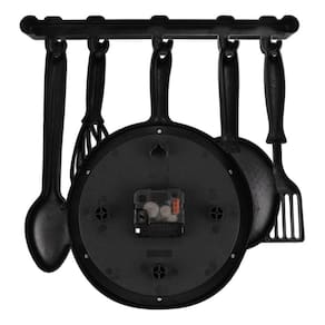 Relógio de parede na cor preta com enfeite em forma de utensílios de cozinha e fundo enfeitado com imagem de um ovo. Relógio com 34 x 33 cm de dimensão. Ponteiros para horas, minutos e segundos. Numeração arábica. Estilo criativo. Material: plástico; Funcionamento: 1 pilha AA