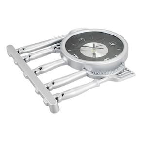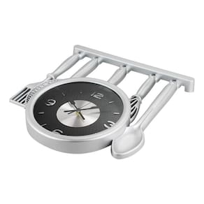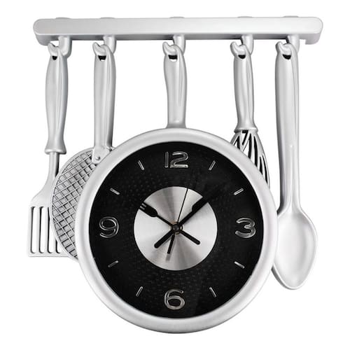 Relógio de parede na cor preta com enfeite em forma de utensílios de cozinha e fundo enfeitado com imagem de um ovo. Relógio com 34 x 33 cm de dimensão. Ponteiros para horas, minutos e segundos. Numeração arábica. Estilo criativo. Material: plástico; Funcionamento: 1 pilha AA