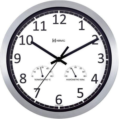 Relógio Parede Herweg alumínio com termômetro e higrômetro Características do produto -moldura em alumínio escovado -fundo: Branco -vidro: Mineral -funções: Termômetro e Higrômetro analógicos -diâmetro: 30,5 cm -peso aproximado: 1000g -garantia Herweg: 1 ano