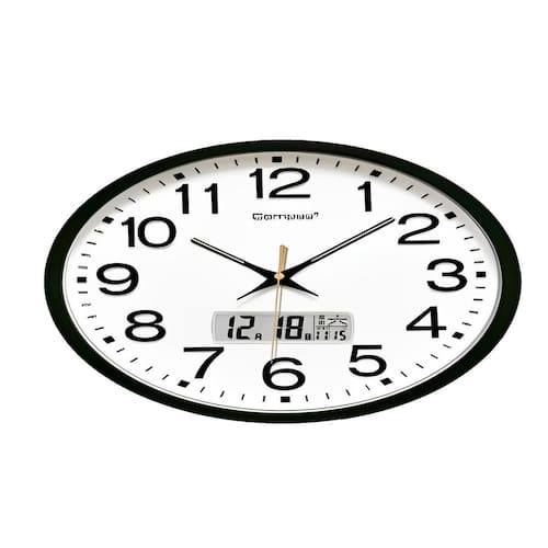 Este relógio combina o charme atemporal de um mostrador analógico com a precisão moderna de um display digital. Com 42 cm de diâmetro, ele se destaca como um peça central em qualquer ambiente. A borda preta oferece um contraste elegante com o mostrador branco, tornando-o fácil de ler à distância. A simplicidade do design é ideal para qualquer decoração, seja em casa ou no escritório, enquanto o mecanismo de dupla função adiciona praticidade e estilo.