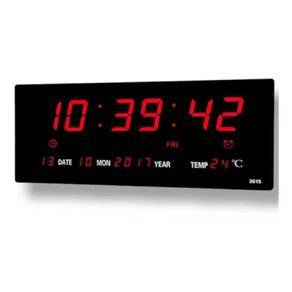 Relógio De Parede LED Digital Características do produto: Excelente nitidez Cor dos Leds: Vermelho Tensão da fonte: 110v / 220v Bivolt Ajuste fácil, através dos botões na parte inferior traseira Marca a hora/minutos/segundos, dia do mês/mês/ano, dia da semana, temperatura Hora: 12/24h Sistema eletrônico de quartz Possui bateria interna para manter memória em caso de falta de energia bateria não incluida Visor de led proporciona visibilidade nítida no escuro Cor do Relógio: Preto Dimensões aproximadas do produto: Comprimento: 36 cm Altura: 15 cm Largura: 3 cm Itens Inclusos: 1 Relógio com visor de LED 1 Fonte de energia bivolt Marca: Não Informado Ean: 0968175326915