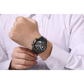 Relógio Phillip London Masculino Ref: Pl80388613m Pr N Cronógrafo Black DESCRIÇÃO DO PRODUTO: Caixa de Metal Pulseira de Aço Vidro de Cristal Mineral Fundo Rosqueado Resistente à Água 5 Atm Diâmetro / Largura da Caixa: 45.00 MM Funções: Analógico, Cronógrafo, Calendário Design Inglês Estilo: Esporte Fino Mostrador Preto com detalhes em vermelho Alimentação do Maquinário: Bateria Garantia de 1 ano Marca: Phillip London