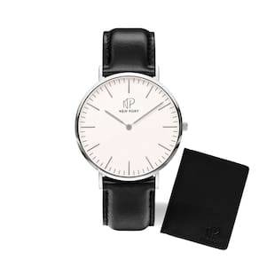 Elegância e praticidade se unem neste exclusivo kit da New Port. Relógio Masculino New Port Preto Pulseira De Couro Vegano Riverside Minimalista 40mm de diâmetro. A caixa é de metal prateada e o mostrador branco, vidro com mineral endurecido com alta resistência. Um relógio clássico, reconhecida por suas linhas limpas e design simples, com um mostrador minimalista e uma pulseira escura perfeita, este relógio é elegante sem esforço. Se destaca em qualquer multidão. Complementando o conjunto, a Carteira Chelsea da New Port, em couro preto premium, oferece o tamanho ideal para cartões, CNH e notas. Organize-se com elegância e durabilidade, transcenda o tempo com este toque sofisticado no seu dia a dia. Este kit reúne a excelência de um relógio clássico e uma carteira prática, proporcionando uma experiência luxuosa e funcional para o homem moderno. A pulseira é de fácil ajuste e se adapta bem a todos os pulsos. Medidas Relógio: - Diâmetro 40mm da caixa - Comprimento da Alça 24cm - Espessura da caixa 7mm - Largura da Correia de 20mm