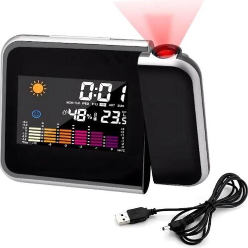 Despertador com Projetor de Horas Inovação e Conforto para o Seu Dia a DiaDescrição: Este despertador multifuncional combina design moderno com alta tecnologia, oferecendo projeção de horário ajustável, leitura de clima e funcionalidades extras que tornam sua rotina mais prática e confortável. Ideal para quem busca um relógio com estilo e recursos úteis para o cotidiano.Principais Características:Projeção Rotativa de Horas: Projete as horas no teto, parede ou em superfícies horizontais, com ajuste de foco e inclinação de até 180 para máxima conveniência.Display LED Colorido: Grande painel iluminado com exibição clara de informações, incluindo data, temperatura, umidade e tendências climáticas.Função Despertador: Som que aumenta gradativamente caso não seja desligado, proporcionando um despertar mais suave e eficaz.Indicadores Climáticos: Mostra se o clima está ensolarado, nublado ou chuvoso, além de um medidor de tendência barométrica.Medidor de Temperatura e Umidade: Monitore as condições ambientais em tempo real, com faixas amplas de leitura:Temperatura: 050C / 32122F.Umidade: 20%RH~99%RH.Função Calendário: Marcação dos dias da semana (de segunda a domingo).Especificações Técnicas:Alimentação: 2 pilhas AAA (não inclusas).Dimensões:Altura: 10 cm.Largura: 2 cm.Comprimento: 14 cm.Distância máxima de projeção: 1,5 metros.Benefícios:Conveniência: Consulte a hora projetada sem sair da cama.Praticidade: Compacto e funcional, combina várias ferramentas em um único dispositivo.Modernidade e Estilo: Design elegante com painel LED e projeção ajustável.Garantia:3 meses contra defeitos de fabricação.Transforme sua rotina com este despertador inovador e multifuncional, ideal para garantir praticidade e conforto em qualquer ambiente!