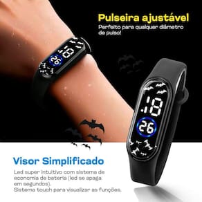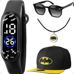 Relógio Prova D'água Digital Infantil + Colar Silicone Óculos Proteção UV Esportivo Boné Criança Kit Infantil Temático Batman - Relógio, Colar, Pingente, Óculos de Sol e Boné