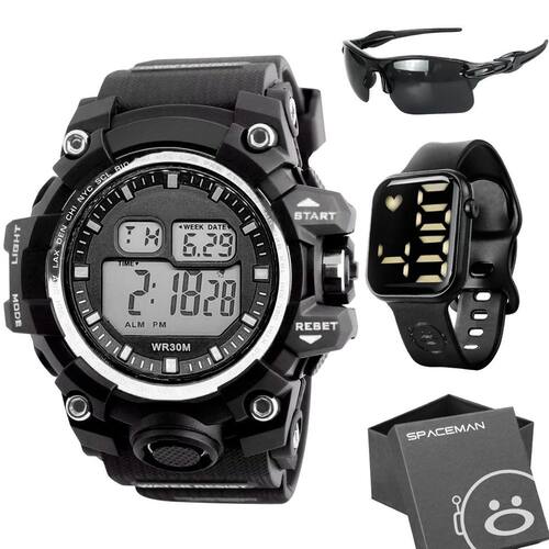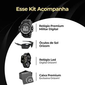 Kit de Acessórios Estilosos Orizom Spaceman Adicione um toque de modernidade e funcionalidade ao seu visual com este conjunto exclusivo de acessórios Orizom Spaceman. Ideal para presentear a si mesmo ou alguém especial.O kit inclui:1 Relógio digital Masculino Orizom Spaceman Preto com Detalhes em Prata - À Prova D'água, Pulseira em Silicone Ajustável e Reforçada, para um estilo elegante e resistente.1 Relógio Masculino Digital Orizom Spaceman - À Prova D'água, para adicionar funcionalidade e modernidade ao seu estilo.1 Óculos de Sol Esportivo Preto Orizom Spaceman - Proteção UV de Qualidade Premium, garantindo proteção e estilo em todos os momentos.1 Caixa Premium Orizom Spaceman para uma apresentação impecável.Aproveite este conjunto exclusivo de acessórios para elevar seu estilo diário. Presenteie-se ou surpreenda alguém especial com este kit estiloso e funcional! Não perca essa oportunidade de deixar o seu visual ainda mais incrível!