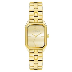 Relógio feminino Anne Klein — Lente de cristal mineral — Mostrador com textura clara de champanhe com ponteiros e marcadores dourados — Pulseira de elos ajustáveis em tom dourado; fecho e extensor de joias; circunferência interna de 7" — Resistente à água até 100 pés (30 m)