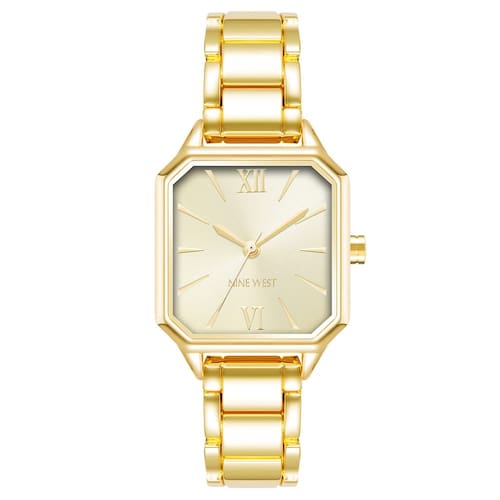 Nine West Relógio de pulseira feminino, Dourado, NW/2902CHGB - Lente de cristal mineral - Mostrador de raio de sol champanhe claro com ponteiros e marcadores dourados - Pulseira de elos ajustáveis dourados; fecho dobrável com botão duplo de segurança - Não é resistente à água