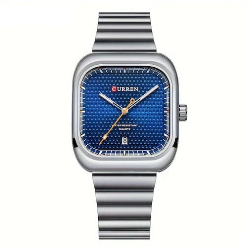 Relógio Quadrado Data Característica Pulseira De Aço Inoxidável à Prova D'água Azul
