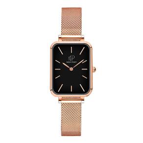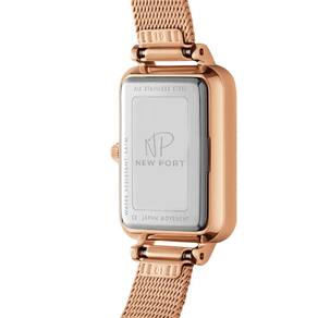 O Relógio Feminino New Port Quadrado Vermont, com sua pulseira de aço inoxidável rosé, apresenta dimensões de 20x26mm. A caixa é fabricada em metal rosé, contrastando elegantemente com o mostrador preto, protegida por um vidro de mineral resistente.