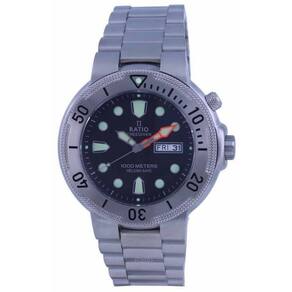 Detalhes do RATIO 1050MD93-02V-BLK: Relógio masculino Ratio FreeDiver Black Dial Stainless Steel Quartz 1050MD93-02V-BLK 1000M Prepare-se para as profundezas do azul escuro! Ele conquistou corações por ser robusto e confiável, dois dos aspectos mais importantes de um relógio destinado a atividades subaquáticas profissionais. É um relógio tecnicamente avançado, incrivelmente bem construído para economizar dinheiro e com um toque esportivo e excêntrico. É feito de forma maravilhosa e oferece uma aparência bastante robusta que é grande, mas sem qualquer presença indesejada no pulso. Características: Caixa de aço inoxidável Pulseira de aço inoxidável Calibre de movimento de quartzo: VX43E Mostrador preto de cristal de safira com logotipo “RATIO” Display analógico Mãos e marcadores luminosos Exibição de dia e data Bisel giratório unidirecional com incrustação de cerâmica Coroa rosqueada Fundo de caixa gravado (com imagem de um mergulhador livre) Fecho de implantação Resistência à água 1000 m Diâmetro aproximado da caixa com coroa: 49 mm Diâmetro aproximado da caixa sem coroa: 46 mm Espessura aproximada da caixa 13 mm