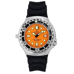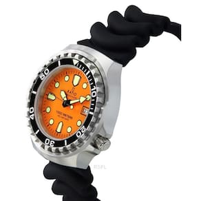 Relógio masculino Ratio FreeDiver Version 02 Helium Safe 1000M Sapphire Quartz Orange Dial 1038EF102V-ORG-V02 Faça uma declaração ousada com o vibrante mostrador laranja do 1038EF102V-ORG-V02, um recurso que garante visibilidade e estilo tanto debaixo d'água quanto em terra. O movimento preciso do quartzo garante uma cronometragem confiável, crucial para navegar em condições extremas de mergulho. A proteção de cristal de safira oferece resistência superior a arranhões, mantendo o mostrador do relógio claro e imaculado. Com 1000 m de resistência à água e segurança contra hélio, este relógio foi projetado para mergulhadores sérios que exigem desempenho e design de destaque. Características: Caixa de aço inoxidável 316L Pulseira de silicone preta Calibre de movimento de quartzo: cristal de safira Seiko VX42E com revestimento antirreflexo Mostrador laranja com logotipo “RATIO” Display analógico Moldura de aço inoxidável com incrustação de cerâmica preta Válvula segura de hélio Mãos e marcadores luminosos Display de data Coroa rosqueada de aço inoxidável Caixa parafusada sólida de aço inoxidável Caixa traseira gravada com imagem de um Free Diver Resistência à água 1000M Diâmetro aproximado da caixa (sem coroa): 46,00 mm Diâmetro aproximado da caixa (com coroa): 49,00 mm Espessura aproximada da caixa: 12,85 mm Largura aproximada do talão: 22,00 mm