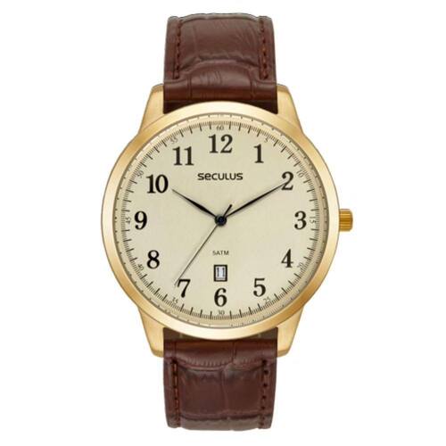 Mecanismo: Analógico (Movimento Miyota) Gênero: Masculino Visor: Dourado Vidro: Cristal mineral Funções: Calendário Prova d'água: 50m Características: Com caixa em aço inoxidável e pulseira em couro Diâmetro da caixa: 42 mm Garantia: 2 anos pelo fabricante Seculus