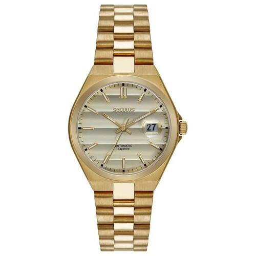Relógio seculus automático 77313gpsvda3 Relógio automático com 21 joias e reserva de carga de 42h, construido todo em aço inoxidável, traz elegância e funcionalidade em um só acessório. Equipado com função calendário com luneta, oferece praticidade para o dia a dia. O fundo em vidro permite uma visualização do movimento interno, destacando a engenharia de precisão. O mostrador verde com efeito adiciona um toque contemporâneo ao design, complementado por uma caixa mediana de 40mm de diâmetro. A pulseira sólida com fecho borboleta garante conforto e um ajuste perfeito para todos os tamanhos de pulso. Este relógio é uma escolha indispensável para quem valoriza estilo e performance em um único acessório. Especificações técnicas Mecanismo: automático movimento miyota cal. 8215 - 21 joias reserva de carga de 42h Gênero: masculino Visor: dourado Vidro: safira Funções: calendário com lupa Prova d'água: 50m Características: com caixa e pulseira em aço inoxidável, fecho borboleta e case back transparente. Diâmetro da caixa: 40 mm : 2 anos pela fabricante seculus