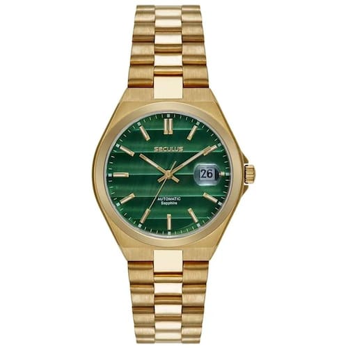 Relógio seculus automático 77313gpsvda4 Relógio automático com 21 joias e reserva de carga de 42h, construido todo em aço inoxidável, traz elegância e funcionalidade em um só acessório. Equipado com função calendário com luneta, oferece praticidade para o dia a dia. O fundo em vidro permite uma visualização do movimento interno, destacando a engenharia de precisão. O mostrador verde com efeito adiciona um toque contemporâneo ao design, complementado por uma caixa mediana de 40mm de diâmetro. A pulseira sólida com fecho borboleta garante conforto e um ajuste perfeito para todos os tamanhos de pulso. Este relógio é uma escolha indispensável para quem valoriza estilo e performance em um único acessório. Especificações técnicas Mecanismo: automático movimento miyota cal. 8215 - 21 joias reserva de carga de 42h Gênero: masculino Visor: verde com efeito Vidro: safira Funções: calendário com lupa Prova d'água: 50m Características: com caixa e pulseira em aço inoxidável, fecho borboleta e case back transparente. Diâmetro da caixa: 40 mm : 2 anos pela fabricante seculus Marca: Não Informado Ean: 7909669201397
