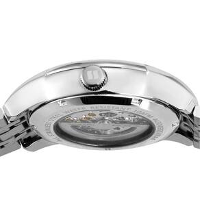 A proteção do mostrador é feita por vidro de safira, altamente resistente a riscos. O fundo rosqueado transparente permite visualizar o funcionamento interno do relógio, reforçando a proposta mecânica do modelo. Sua construção oferece resistência à água de até 10 ATM, garantindo durabilidade superior e maior tranquilidade no uso diário.