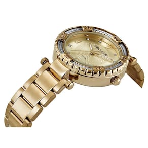 O mostrador dourado traz efeito geométrico no centro e marcadores de hora com cristais aplicados, reforçando a feminilidade e o requinte do relógio. A pulseira em aço inox dourado completa o visual sofisticado, ideal para mulheres que desejam um acessório versátil, capaz de transitar entre ocasiões casuais e formais.