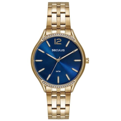 O Relógio Seculus 77250LPSVDS2 é a escolha ideal para quem busca elegância com um toque de sofisticação moderna. Sua caixa de 40 mm em aço inoxidável dourado apresenta acabamento refinado, com aplicação de cristais discretos na parte superior e inferior do aro, realçando o brilho do acessório.