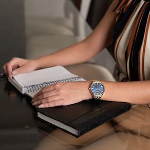 O mostrador azul metálico se destaca pelo design minimalista, com marcadores e ponteiros dourados que garantem excelente contraste e legibilidade. A pulseira em aço inoxidável dourado completa o visual imponente e versátil, ideal tanto para o dia a dia quanto para ocasiões especiais.