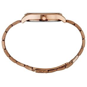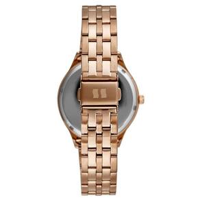 O mostrador rosé metálico harmoniza perfeitamente com os ponteiros e marcadores da mesma cor, criando uma estética uniforme e sofisticada. A pulseira em aço inoxidável rosé reforça a modernidade do modelo, tornando-o versátil para diferentes ocasiões, do dia a dia a eventos especiais.