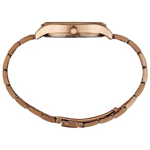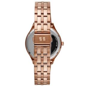 A pulseira em aço inoxidável rosé, com design robusto e fecho dobrável, garante conforto e segurança no uso. Além disso, a peça conta com detalhes de cristais aplicados no aro, reforçando o aspecto refinado do modelo.