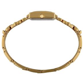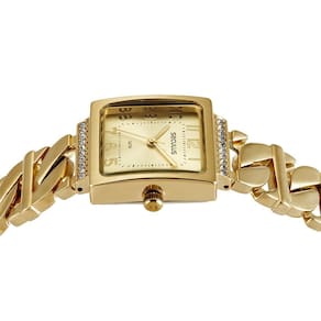 Material da pulseira: Aço dourado com elos largos e detalhes em cristais