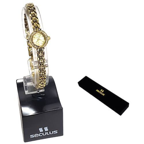 Marca: Seculus Modelo: 20091LPSVDA3 Tipo de relógio: Analógico Gênero: Feminino Cor da caixa: Dourado Cor da pulseira: Dourado Estilo: Casual Alarme: Não Cronômetro: Não Calendário: Sim Luz: Não Resistência à água: Sim – 3 ATM = 30 metros Tipo de fecho: Fecho joia Material da caixa: Aço Material da pulseira: Aço Características do vidro: Vidro mineral Tamanho da caixa: 14 mm Espessura da caixa: 6 mm Comprimento da pulseira: 19 cm Largura da pulseira: 6 mm Tampa do fundo: Pressão Peso: 17 Gramas Alimentação: Bateria Garantia do Fabricante: 24 meses Fabricante: Seculus da Amazônia Indústria e Com S/A