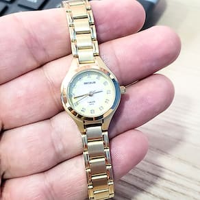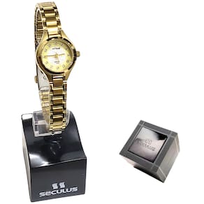 Marca: Seculus Modelo: 44049LPSVDA1 Tipo de relógio: Analógico Gênero: Feminino Cor da caixa: Dourado Cor da pulseira: Dourado Estilo: Casual Alarme: Não Cronômetro: Não Calendário: Sim Luz: Não – ponteiros fluorescentes Resistência à água: Sim – 5 ATM = 50 metros Tipo de fecho: Dobrável, com trava lateral Material da caixa: Aço Material da pulseira: Aço Características do vidro: Vidro mineral Tamanho da caixa: 22 mm Espessura da caixa: 9 mm Comprimento da pulseira: 22 cm Largura da pulseira: 10 mm Tampa do fundo: Rosqueado Peso: 32 Gramas Alimentação: Bateria Garantia do Fabricante: 24 meses Fabricante: Seculus da Amazônia Indústria e Com S/A