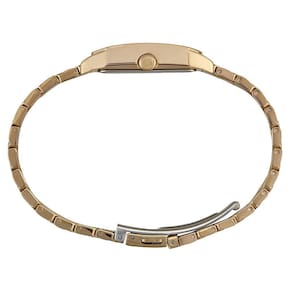 Vidro: cristal mineral Funções: analógico, calendário Resistencia à água: 50 m Características: com caixa de metal e pulseira de aço Diâmetro da caixa: 2,3 cm x 3,0 cm Fundo de pressão Alimentação do maquinário: bateria Mostrador champanhe com números Aro de pedras