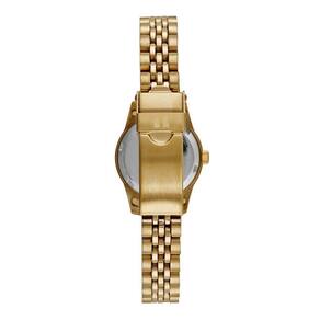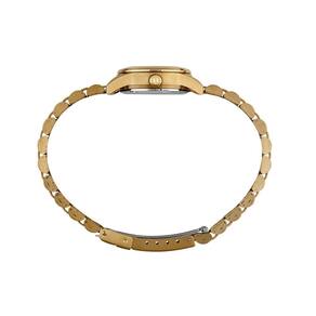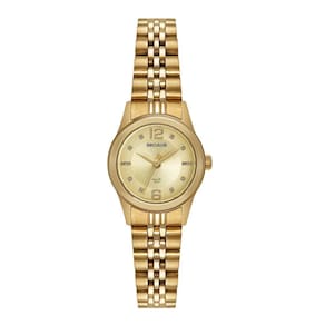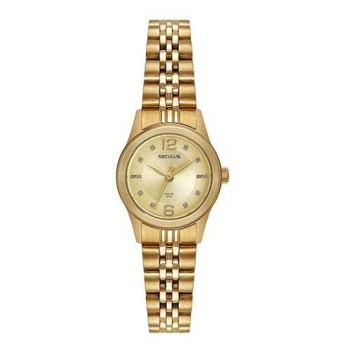 Vidro: cristal mineral Funções: analógico Resistencia à água: 50 m Características: com caixa de aço e pulseira de aço Diâmetro da caixa: 2,5 cm Fundo rosqueado Alimentação do maquinário: bateria Mostrador dourado com pedras e números Linha: seculus long life