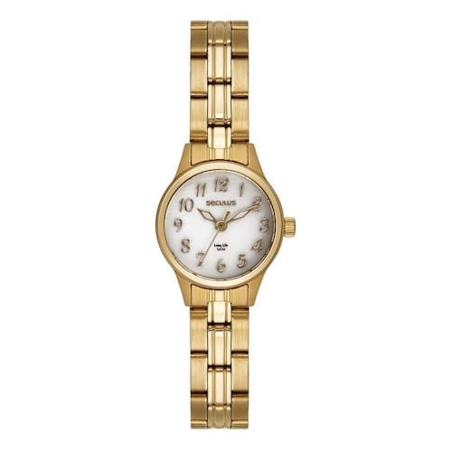 Relógio seculus feminino ref: 44196lpsvda2 clássico aço dourado Descrição do produto: Vidro: cristal mineral Funções: analógico Resistencia à água: 50 m Características: com caixa de aço e pulseira de aço Diâmetro da caixa: 2,2 cm Fundo rosqueado Alimentação do maquinário: bateria Mostrador madreperola branco com todos os números Linha: seculus long life de 2 anos Marca: Não Informado