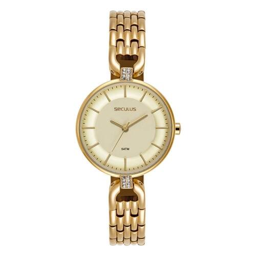 Relógio seculus feminino ref: 44286lpsvdb1 bracelete dourado Descrição do produto: Vidro: cristal mineral Funções: analógico Resistencia à água: 50 m Características: com caixa de metal e pulseira de metal estilo bracelete Diâmetro da caixa: 3,2 cm Fundo rosqueado Alimentação do maquinário: bateria Mostrador dourado Movimento japonês de 2 anos Marca: Não Informado