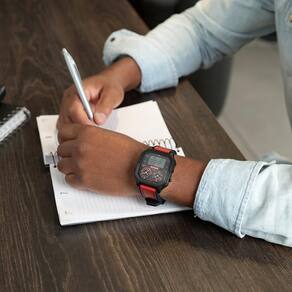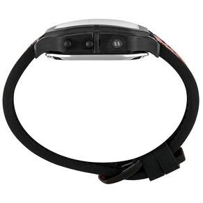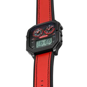 A caixa preta com formato robusto reforça o estilo moderno e imponente, enquanto a pulseira preta com detalhes em vermelho entrega um visual marcante e esportivo. O mostrador segue a mesma identidade, com grafismos contrastantes e ótima legibilidade.
