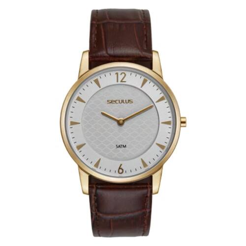 Relógio seculus slim 23743gpsvdc2 dourado Relógio analógico com caixa em aço slim. A pulseira marrom em couro com textura croco e fecho de fivela garante um ajuste perfeito e confortável ao pulso. Um acessório para deixar o visual ainda mais sofisticado Especificações técnicas Mecanismo: analógico movimento miyota Gênero: masculino Visor: branco Vidro: cristal mineral Prova d'água: 50m Características: com caixa em aço e pulseira em couro Diâmetro da caixa: 38 mm : 2 anos pelo fabricante seculus Marca: Não Informado Ean: 7909669203186