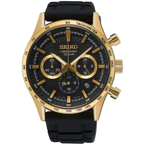 Características Formato do relógio: redondo Composição do vidro: safira Material da caixa: aço inox Cor da caixa: dourado Cor do mostrador: preto Material da pulseira: borracha Cor da pulseira: preto Mecanismo: analógico multifunção