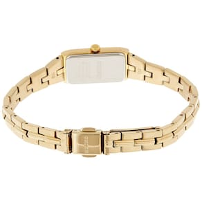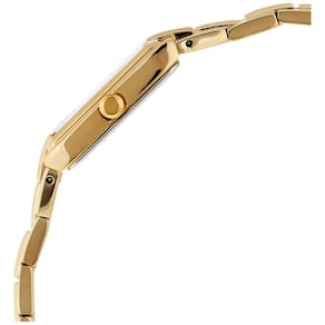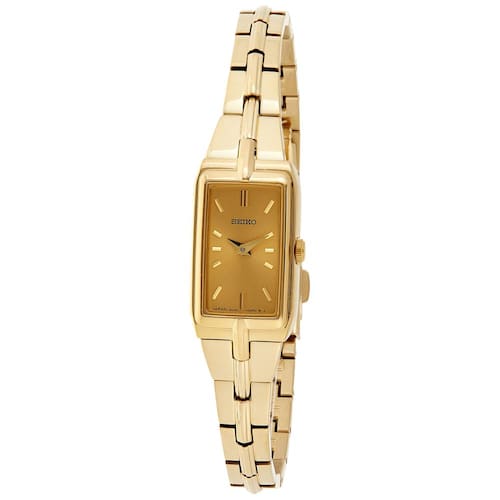 - Mostrador de champanhe: este elegante relógio feminino retangular possui um mostrador dourado minimalista com ponteiros e marcadores indicadores de mostrador dourado