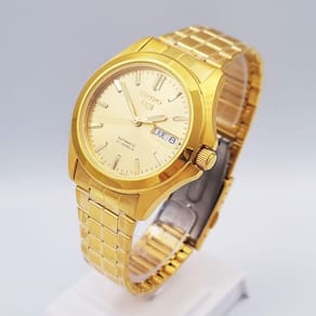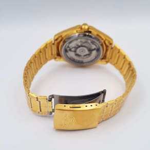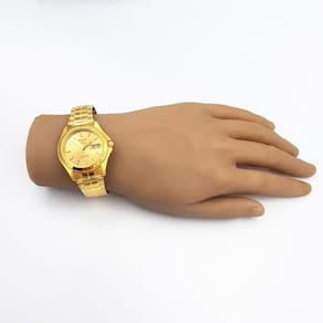 Características Formato do Relógio: Redondo Composição do Vidro: Cristal mineral Material da Caixa: Aço Inox Cor da Caixa: Dourado Cor do mostrador: Dourado Material da Pulseira: Aço Inox Cor da Pulseira: Dourado Mecanismo: Automático-Mecânico