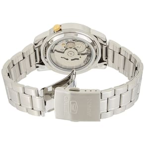 Mostrador dourado aprimorado por ponteiros luminosos dourados. Caixa de aço inoxidável prateada com uma pulseira de aço inoxidável prateada. Movimento automático. Resistência à água até 30 metros. Bisel fixo. Cristal mineral resistente a riscos. Fundo da caixa transparente. Dobra com fecho de botão de liberação. Coroa de puxar e empurrar. Tamanho da caixa: 38 mm x 11 mm. Faixa de 20 mm x comprimento. Relógio Seiko SNKK13J1 Series 5.