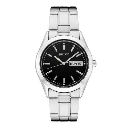 Relógio masculino SEIKO SUR361 — Essentials — com mostrador preto, calendário de dia/data, ponteiros e marcadores LumiBrite, estojo e pulseira de aço inoxidável e 100 m resistente à água
