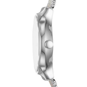 - Mostrador: caixa de aço inoxidável redonda elegante em dois tons, prata e ouro rosa, com mostrador prateado e detalhes em cristal.