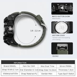 -marca: smael -modelo: 1545 -estilo: esporte -gênero: masculino -tipo de item: relógios de pulso dual display -tipo de material da pulseira: borracha e plástico -largura da pulseira: 21 mm -comprimento da pulseira: 220 mm -material da caixa: plástico -forma do caixa: redonda -diâmetro do mostrador: 48 mm -espessura da caixa: 17 mm -movimento: exibição dupla -tipo de fecho: fivela -tipo de material do vidro: acrílico -resistência à água: 3 bar