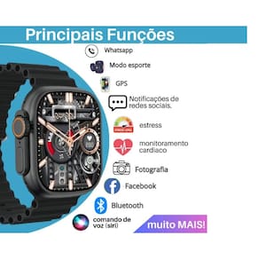 Smartwatch T900 Ultra com tela infinita de 1.99 polegadas. Compatível com Android e iOS. Construído em liga de zinco. Inclui chave lateral para acesso rápido às funções. Acompanha 2 pulseiras. Realiza chamadas via Bluetooth, exibe notificações inteligentes (WhatsApp, Facebook, SMS), monitora frequência cardíaca, pressão arterial e qualidade do sono. Possui modos de esportes, controle de mídia e personalização de mostradores (watchfaces).Processador